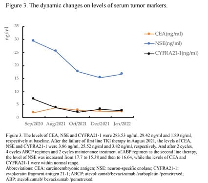 Due to the high PD-L1 expression, we challenged a combined treatment of immunochemotherapy and antiangiogenic therapy consisting of atezolizumab (1200 mg) / bevacizumab (7.5 mg/kg) / carboplatin (AUC 5) / pemetrexed (500 mg/m2) (ABCP). And after two cycles’ treatment, not only the primary lung lesion, but also the multiple brain metastases lesions were evaluated as PR (Figure 2). However, the patient had some central nervous system symptoms, including nausea, dazzling and headache after 1 cycle treatment. And after 4 cycles, the lung primary lesion and brain lesions were assessed as confirmed PR with chest CT and brain MRI. The lung lesion was evaluated PR while the brain metastases lesion in frontal lobe a little bit enlarged by brain MRI after 2 more cycles maintenance treatment of atezolizumab (1200 mg) / bevacizumab (7.5 mg/kg) / pemetrexed (500 mg/m2) (ABP), the overall evaluation was PR. The level of carcinoembryonic antigen (CEA), neuron-specific enolase (NSE) and cytokeratin fragment antigen 21-1 (CYFRA21-1) all showed a downward trend in the course of treatment (Figure 3). Until now, the patient had received 4 cycles ABCP regimen and 2 cycles ABP regimen treatments and will receive whole brain radiotherapy before next cycle of treatment.