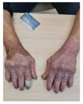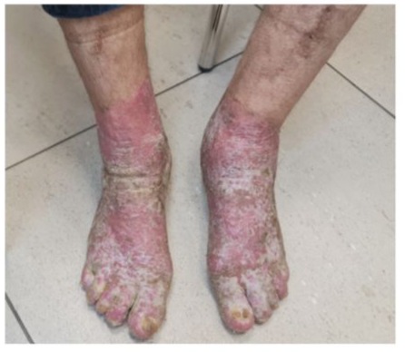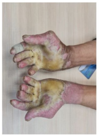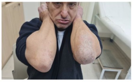 A 57-year-old man with genetically confirmed epidermolytic hyperkeratosis (onset in infancy) presented with progressive polyarticular pain, morning stiffness (>2 hours), and functional impairment in his hands and feet. Cutaneous examination revealed thickened, hyperkeratotic plaques and verrucous lesions on the palms and soles (Figure 1,2). Musculoskeletal evaluation demonstrated bilateral synovitis, ulnar deviation, and deformities of the metacarpophalangeal (MCP) and proximal interphalangeal (PIP) joints, alongside similar involvement of the metatarsophalangeal (MTP) joints.