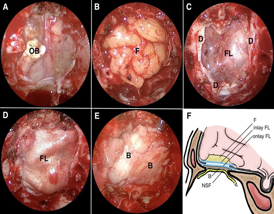 Figure 2: Intra-operative photographs. (A) The extent of skull base defect after tumor resection. (B) The fat graft was placed in the subdural resected cavity and embedded in the bony or dural border of the defect. (C) The first layer of autologous fascia lata was inserted as an inlay graft inside the dural edge. (D) The second layer of autologous fascia lata was inserted as an extradural onlay graft inside the bone edge. (E) Rigid buttress bone graft was inserted between the onlay fascia lata and bone edge. (F) Diagrammatic representation of the autologous rigid reconstruction of an anterior skull base defect layer by layer in sagittal view. (OB: olfactory bulb; FL: fascia lata; D: dura; B: bone; NSF: nasoseptal flap; F: Fat)
