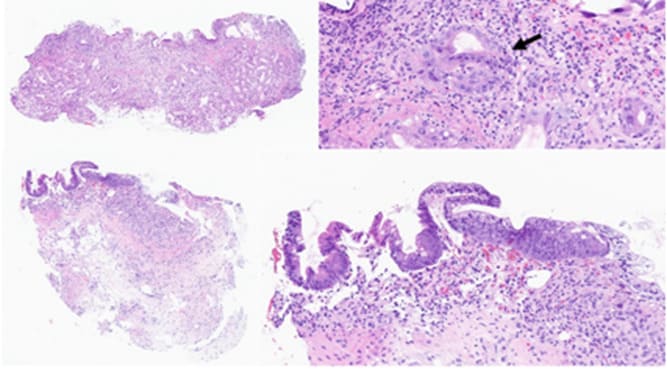 However, he was readmitted on d+31 due to a BK virus hemorrhagic cystitis. Two days later, he presented with high-volume watery diarrhea and hematochezia complicated by major electrolyte imbalances. This required admission to the pediatric intensive care unit on d+36. A grade IV gastrointestinal aGvHD was confirmed by upper gastrointestinal and rectal histology on d+38 (Figure 1, A and B; Figure 2) and was accompanied by a grade II cutaneous aGvHD (on d+37). A bronchoalveolar lavage performed at the same time revealed the presence of rare epithelial cell atypia compatible with a diagnosis of pulmonary GvHD. The patient was thus diagnosed with an overall grade IV aGvHD. Its management and evolution are summarized in Figure 3. Although a concomitant increase in bilirubin was observed, values remained below the threshold for hepatic aGvHD.