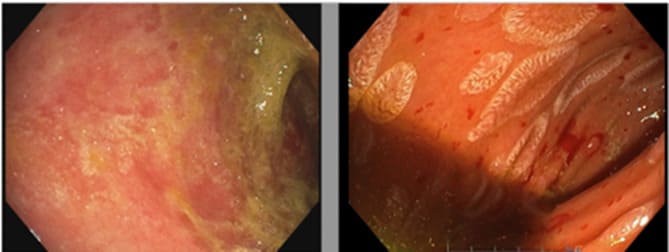 Figure 2: Endoscopic images of the duodenum. On the left (d+38) before mesenchymal cell administration, showing mucosal atrophy, absence of villi and fibrin deposits. On the right (d+70) and D+23 after the first injection of MSCs, revealing islands of re-epithelialization despite mucosal hemorrhagic fragility.