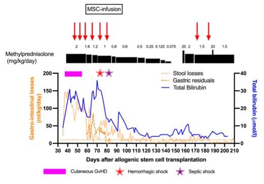 After nine days of methylprednisolone, a weekly MSC–FFM treatment was initiated that led to partial resolution of the gastrointestinal symptoms at D+18 after the first infusion of MSC–FFM and transient complete clinical remission of the gastrointestinal SR-aGvHD at D+79.