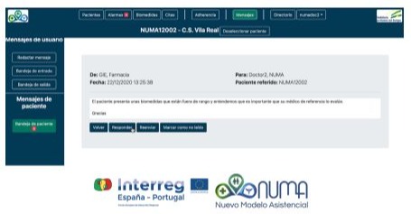 Communication channel: As previously mentioned, all the professionals (included in a searchable directory) who are part of the new care model have access to a dedicated and direct communication channel in which they can share messages with each other (marked as prioritized or not) and information registered in the new care model, as well as diagnoses, assessments or any information referring to patients, always anonymously. It can be seen in Figure 3 how send, receive and reply messages services are available as well as linking the messages to a specific patient profile or not. Moreover, since this is a service deployed in the central server, the access path to it is made, again, through the secured MPLS network.