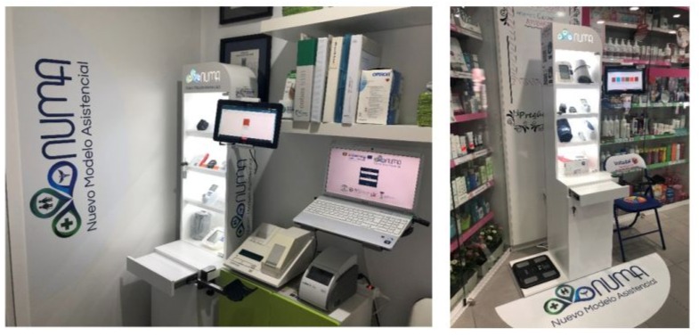 The service point of the new healthcare model is presented as an area of the pharmacy offices in which all the services contemplated in each of the use cases included in the proposed model are offered comprehensively. This service point has been designed with an attractive aesthetic line in accordance with the aesthetic lines followed in pharmacies as it is shown in Figure 4. In this sense, it has logos and signage that clearly identify it, as well as a series of backlit compartments to present the biosensors and the tablet in an attractive way, as well as an articulated arm for taking blood pressure, a retractable tray to facilitate the task of the pharmacy staff and a lower compartment for the storage of biomedical consumables. Finally, all the equipment is protected under lock and key or by means of security cables.