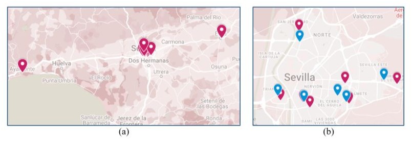 Figure 5: Pilot deployment map. (a) Spanish pharmacies, (b) Pharmacies – red- and Healthcare Centres -blue- deployed in Seville city.