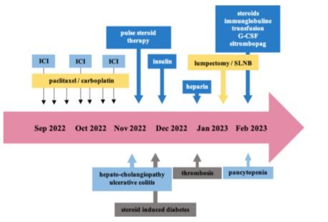 The course of these three cases described above highlight the diverse spectrum of irAEs, which range from autoimmune pneumonitis to severe aplastic anaemia and hepato-cholangiopathy. These examples underscore the complexity and severity of irAEs, which can significantly affect patient outcomes if not managed appropriately. Effective management strategies must, therefore, include early identification of these adverse events, a multidisciplinary approach to patient care, and prompt interventions to mitigate potential lifethreatening consequences. Hence, the intervention in those three cases involved the immediate initiation of corticosteroids and the cessation of neoadjuvant systemic therapy. This strategy was pivotal in mitigating the severity of the irAEs, leading to partial or even complete resolution of the toxicities in some instances. These outcomes align with current guidelines, which recommend the judicious use of immunosuppressive therapies to control severe irAEs while trying to preserve the underlying anti-tumor immune responses. The goal is always to strike a balance minimizing the risk of life-threatening adverse effects without compromising the efficacy of immunotherapy.