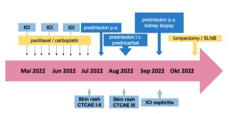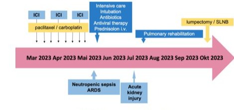 Given the severity of immune-related and infectious complications, neoadjuvant therapy was discontinued. The patient subsequently underwent a lumpectomy with SLNB. Histopathological analysis revealed a partial remission (ypT1a, ypN0 with 0/2 sentinel nodes, ypL0, ypV0, ypPn0, ypR0). Postoperative systemic therapy was deemed contraindicated, and the patient proceeded with adjuvant radiotherapy.