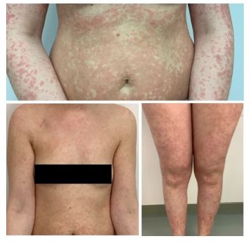 Following the third dose of pembrolizumab, the patient developed a skin rash graded as CTCAE Grade I-II, accompanied by minimal itching. Oral prednisolone (10 mg/day) was initiated but was progressively increased to 80 mg/day due to the persistence and worsening of the rash. As the rash progressed to CTCAE Grade III (Figure 4), the patient was hospitalized and treated with intravenous prednisolone (up to 120 mg/day), topical prednicarbate, and supportive therapies for itching and tingling.