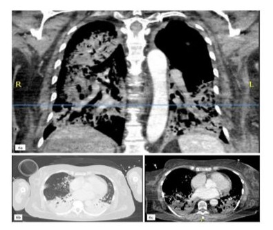 Figure 6: Pulmonary imaging findings presenting an acute, ICIinduced pneumonitis with a bacterial superinfection (6a-c).