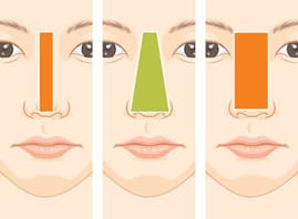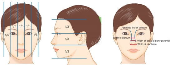 The width of the implant is as important as the height of the implant. Even an expert surgeon may focus on the height of the implant, but not consider the width of the implant unintentionally. Incorrect selection of an implant may cause the visible edge of the implant or an awkward and unnatural-looking nasal shape. Nasal width is evaluated in frontal view, similarly to inter-alar distance. It is assumed ideal if it is one fifth of the total facial width. a quarter of facial width, about 3.5cm, is generally considered beautiful in Korean females. Nasal width is subdivided into dorsal width and bony base width (Figure 2). Dorsal width is considered as the width between the dorsal aesthetic lines and is similar to the width of tip defining points, which is 6-8mm in Caucasian females, and 8-10mm in Caucasian males. The width of nasal bones seems to be wide if a bony base width is wider than the intercanthal distance and, therefore, osteotomy should be considered before selecting implant.