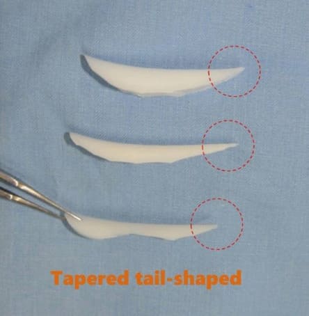 nasal dorsum in this way for the following three reasons: First, the thickness and texture of the nasal envelope are different according to the location. Second, the exact shapes of nasal bone and upper lateral cartilage vault are not reflected through nasal envelope. Last, tip plasty alters the length and height of the implant. Therefore, it is preferred to design the implant after tip plasty is accomplished during the surgery. However, the flexibility of the operative plan and diversity of surgeon`s approaches should be respected as well. The authors prefer a nasal implant with a tapered tail shape. A tapered tail shape means that the thickness of the implant gets thinner caudally. It helps long-term stability, prevention of complications and ease of revisional operation, although implant carving itself is difficult and tip plasty has to be completive (Figure 8).