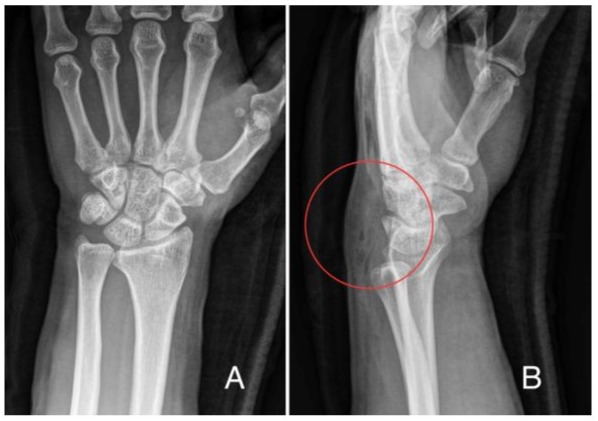 Figure 1: The plain radiographs at initial visit showed no definite fracture at both wrists (A) Postero-anterior (B) Lateral (red circle): Soft tissue swelling of the wrist dorsum was observed.