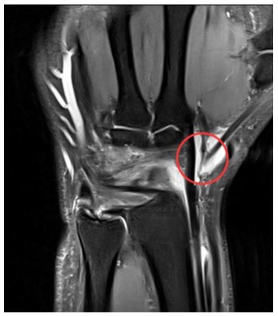 Figure 2: On MRI (T2 Coronal), an EPL tendon rupture was observed and the distal stump was identified around the 1st carpometacarpal joint (red circle). Fluid collection was observed around the ruptured tendon ends and there was no signal change of distal radius or other carpal bones, suggesting a bone contusion or a micro-fracture.