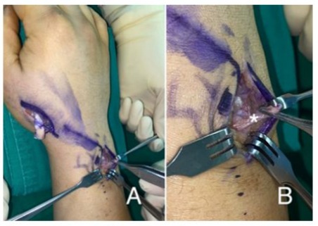 Figure 3: The torn EPL tendon ends were identified (A). The proximal stump was found slightly proximal to the Lister’s tubercle and the distal stump at the dorsum of radio-scaphoid joint. The proximal stump (white Asterix) was 3cm long and very thin, which had little tendon tissue and was surrounded with thick synovial sheath (B).