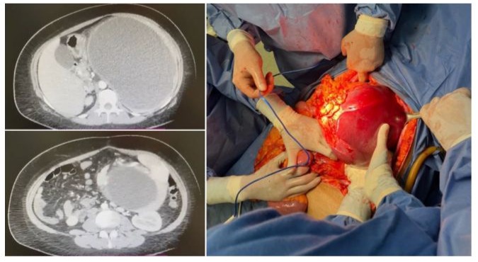 A 22-year-old female patient was admitted to the emergency room on November 8, 2023 due to pain in the left hypochondrium, fever of 39°C, and wet cough. The condition began on September 13 with pain in the right scapular area that radiated to the left hypochondrium. She was initially treated with analgesics and antibiotics without improvement. The initial ultrasound was inconclusive, so an abdominal computed tomography (CT) scan was performed, which revealed a complex cystic lesion dependent on the spleen measuring 240x171x190 mm, with smooth edges and some calcifications. Loss of the usual morphology of the spleen and displacement of adjacent structures were observed, accompanied by left laminar pleural effusion. CA 19-9 levels were 25.5 U/mL. The initial diagnosis was a giant splenic cyst. During the preoperative evaluation, the patient was classified as having ASA III anesthetic risk. Preoperative examinations showed anemia (Hb: 9.6 g/dL) and coagulation disorders (INR: 1.57), so she was given a preoperative transfusion of packed red blood cells and fresh frozen plasma to correct the anemia and coagulation disorders. An exploratory laparotomy was scheduled for November 14, a procedure that lasted approximately 4 hours and revealed the following findings: (1) a giant 40x30 cm splenic cyst with greenish contents, (2) firm adhesions to the tail of the pancreas, stomach, colon, and omentum, (3) an ovarian cyst, and (4) no visible or palpable liver lesions.