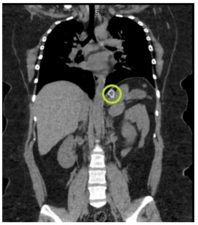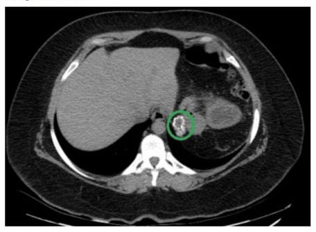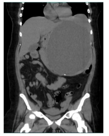 Figure 2: The initial ultrasound was inconclusive, so an abdominal tomography (CT) was performed, which revealed a complex cystic lesion dependent on the spleen measuring 240x171x190 with smooth edges and some calcifications