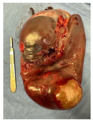 Figure 3: Total splenectomy due to the size of the spleen, the decision to perform a total splenectomy in this case was based on the exceptional size of the cyst (40x30 cm)