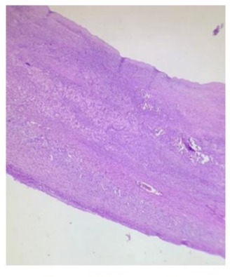 Connective tissue wall with collagenized areas as well as sparse remnants of splenic tissue and areas of coagulative necrosis with simple flat epithelium