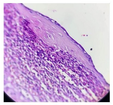 Connective tissue wall with collagenized areas as well as sparse remnants of splenic tissue and areas of coagulative necrosis with simple flat epithelium Pathology images by Dra. Maria Elena