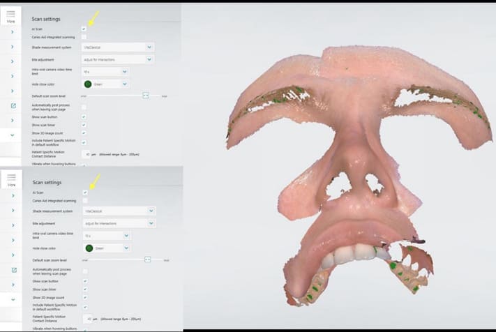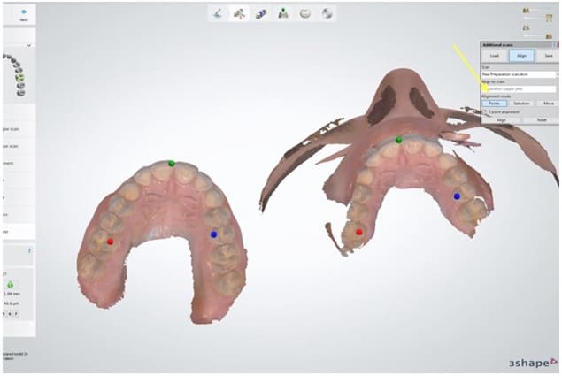 Compared to the technique proposed by Lo Russo, et al. [12] scanning the posterior teeth also allows for the correct sagittal and horizontal alignment of the arches during the superimposition with the facial scan. Furthermore, thanks to the CAD-CAM software program (Dental System; 3 shape A/S) cross-sectional tool, it is possible to assess the accuracy of alignment and correct it by slightly shifting any of the 3 superimposed scans, reducing the risk of mismatching.