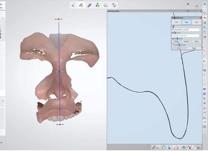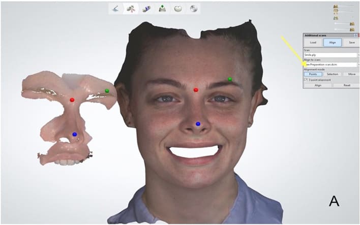 A technique that allows clinicians and dental technicians to obtain valuable information regarding the relationship between patient smile and patient face is presented. Intraoral, perioral, and facial scans are superimposed easily without any scan abutment, aligner, or skin landmarks, with a CAD software program and an alignment point tool. Furthermore, the spatial alignment of dental arches on facial scan could be more precise than other techniques proposed, thanks to the perioral scan that should include the upper premolar and molar teeth surface and not only incisors.