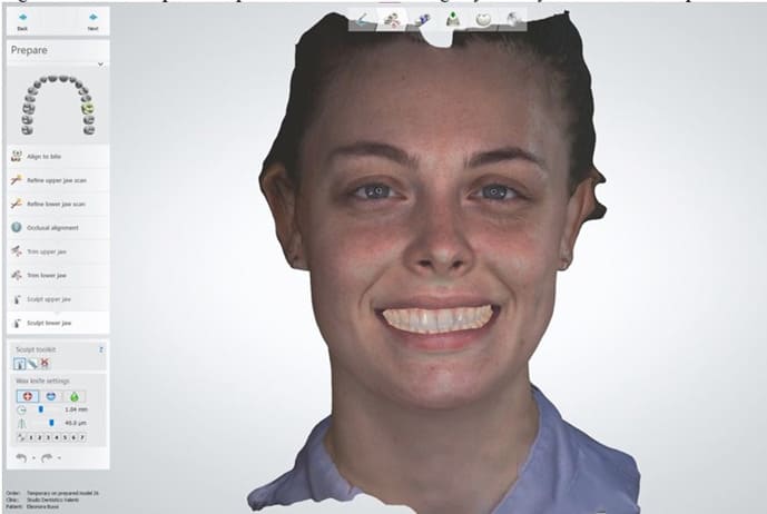In prosthetic treatments involving the esthetic area, the challenge for the dental technician and dentist is to precisely define the interpupillary and midsagittal planes to correctly establish ideal teeth shape concerning the patient’s smile line and lips position (Figure 10). Facial scanning, in comparison to the 2D photography, offers greater accuracy [14], and by incorporating 3D restorations design onto the 3D facial file, it is possible to assess the shapes of the teeth on the x-y-z axis and evaluate their aesthetic outcome before testing it on the patient with interim restorations or resin mock-up. Both facial scanning and its superimposition with intraoral scanning must be accurate to perform these assessments [15].