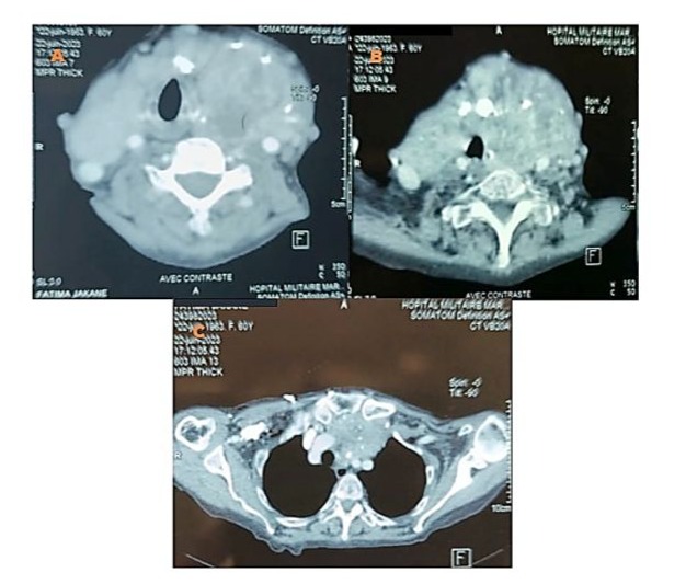 Figure 1: Axial CT scan with contrast injection showing overall hypertrophy of the thyroid gland, predominantly involving the left lobe, with irregular and nodular contours. The gland exhibits spontaneously heterogeneous density with heterogeneous enhancement (A, B). The upper aerodigestive tract remains unobstructed, with posterior and rightward displacement of the larynx and trachea, whose lumen remains patent and of normal caliber. (A, B) It extends to the superior mediastinum through the thoracic inlet, in a retrosternal position, filling the prevascular space up to the level of the superior border of the aorta and the supra-aortic trunk, which remain patent and uninvolved. (C)