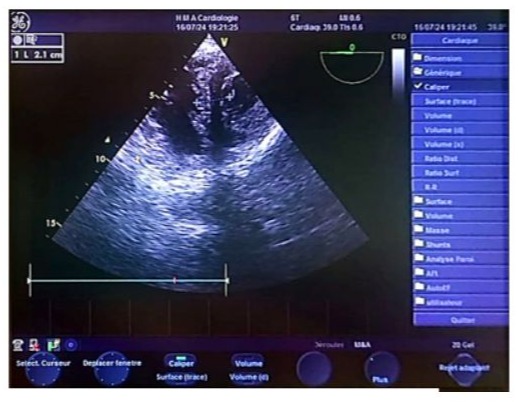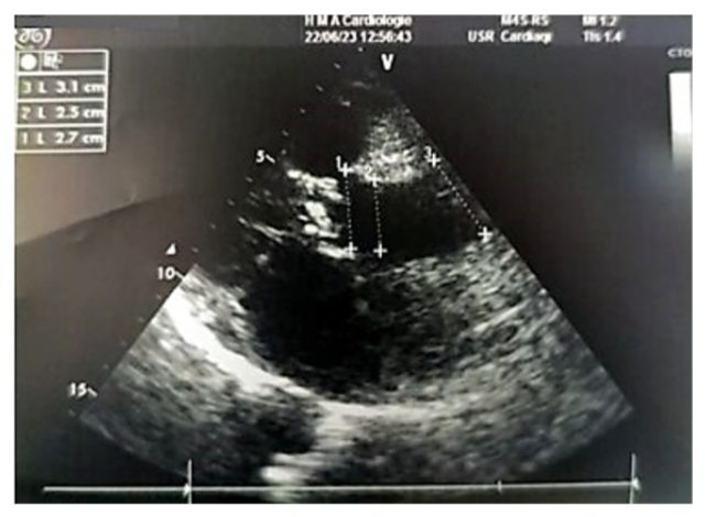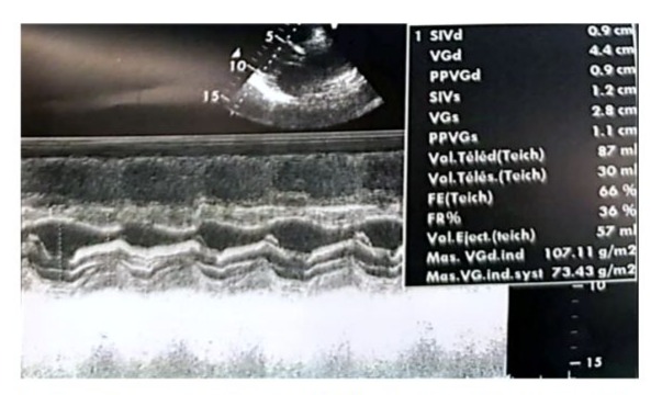 Figure 2: Real-time echocardiographic image showing a non-dilated, hypertrophied left ventricle with an interventricular septum measuring 0.9 cm in diastole and 1.2 cm in systole. The indexed left ventricular mass was 107.11 g/m², indicating eccentric remodeling. The left ventricular end-diastolic diameter (EDD) measured 44 mm, the end-systolic diameter (ESD) measured 28 mm, and systolic function was preserved with an ejection fraction (EF) of 66% (Teichholz method). The shortening fraction was within the normal range at 36%.