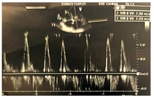Figure 3: Doppler echocardiographic image of the transmitral antegrade flow showing a non-elevated mitral E-wave velocity of 1.36 m/s (<1.5 m/s), with the absence of an A-wave due to atrial fibrillation.