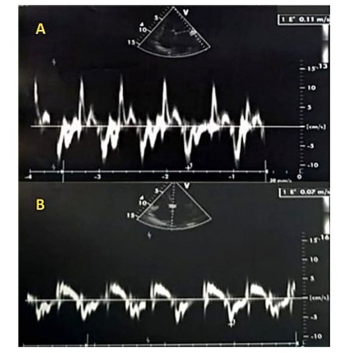 Figure 4: Tissue Doppler imaging (TDI) at the mitral annulus was performed using a 4-chamber view, minimizing filters and gains, and placing the sampling window at the lateral annulus (A) or the septal annulus (B). The TDI recording showed a positive systolic wave followed by a single diastolic Ea wave at 7 cm/s lateral, (A) and 11 cm/s septal, (B), with no Aa wave due to atrial fibrillation. The absence of significant reduction in the Ea wave indicates normal flow, as in healthy individuals, the Ea wave is typically greater than 8 cm/s
