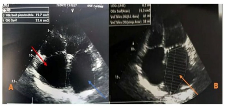 Figure 5: Zoomed echocardiographic image in the apical 4-chamber view focusing on the atria, showing a dilated left atrium with a surface area of 23.6 cm² (Figure A, blue arrow) and a volume of 58 ml/m² (Figure B, orange arrow). The right atrium is also dilated, measuring 19.7 cm², and appears free of echoes (Figure A, red arrow).