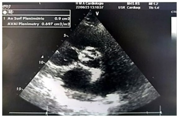 Figure 6: Parasternal short-axis echographic image showing a valvular area of 0.9 cm² by planimetry (indexed area of 0.7 cm²/m²).