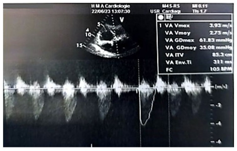 Figure 7: Doppler echocardiographic image in the 5-chamber view at the level of the aortic valve, showing a mean transvalvular gradient of 35 mmHg.