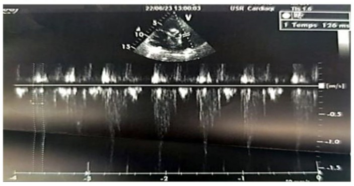 Figure 9: 2D echocardiographic image in the parasternal short-axis view, with pulsed Doppler pointed a few millimeters below the pulmonary valve (in the right ventricle), showing a pulmonary acceleration time to reach the peak velocity with an intermediate value of 126 ms, which is neither short (<90 ms) nor long (>130 ms).