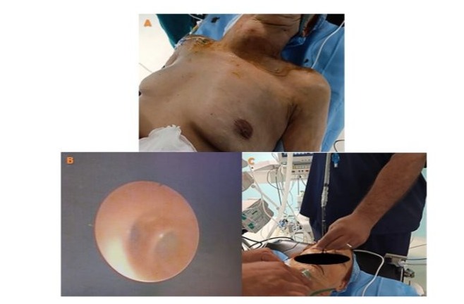 Figure 10: Image before anesthetic induction for the first surgical stage (total thyroidectomy), showing a large goiter and the beginning of awake nasotracheal intubation using a nasofibroscope after regional anesthesia. The image also shows the visualization of the carina with the right and left mainstem bronchi after successful passage through the glottis.