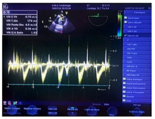 Figure 14: Transesophageal echocardiography (TOE) at the mid-esophageal level, with the sampling window positioned at the distal tips of the mitral leaflets, showing during a transient postoperative passage in sinus rhythm a pseudo-normal flow pattern with an E-wave velocity of 0.70 m/s, an A-wave velocity of 0.30 m/s, an E/A ratio of 1.93 (>1.5), and a calculated deceleration time of 174 ms.