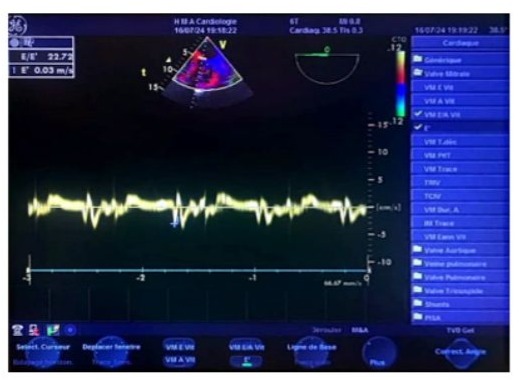 Figure 15: Transesophageal echocardiography (TOE) tissue Doppler at the mid-esophageal level in a 4-chamber view, during a transient postoperative passage in sinus rhythm. The sampling window is positioned at the septal mitral annulus, showing an Ea/Aa ratio <1, indicating impaired relaxation (normalized profile), and an E/Ea ratio of 22, suggesting significantly elevated left ventricular filling pressure.