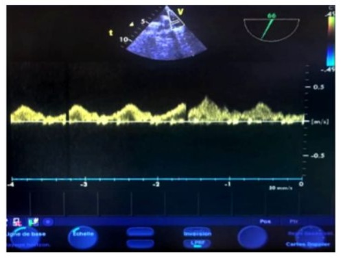 Figure 16: Transesophageal echocardiography (TOE) at the upper esophageal level, with an antih clockwise rotation and a 60° plane of section. The sampling window is positioned 1 cm before the left superior pulmonary vein confluence, showing normal pulmonary flow with a positive systolic wave (S), a positive diastolic wave, and a small retrograde negative A-wave in the late diastole.