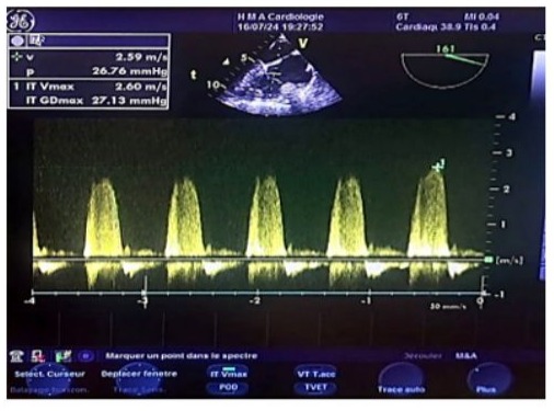 Figure 18: Continuous wave Doppler transesophageal echocardiography (TOE) image of the vena contracta in tricuspid regurgitation (reflux within the tricuspid annulus), showing a normal systolic pulmonary artery pressure estimated at 38 mmHg, with a maximum tricuspid regurgitation velocity of 2.60 m/s. The estimated pulmonary artery diastolic pressure (POD) is 10-15 mmHg, and the tricuspid gradient is 27 mmHg.