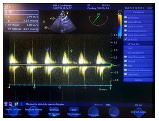 Figure 19: Transesophageal echocardiography (TOE) at the upper esophageal level, at a 50° oblique plane, with continuous Doppler pointed a few millimeters below the pulmonary valve, showing a maximum average velocity of 0.95 m/s, an average velocity of 0.56 m/s, a maximum mean gradient of 4 mmHg, an isovolumic time (IVT) of 20 cm, and the absence of any detectable pulmonary.