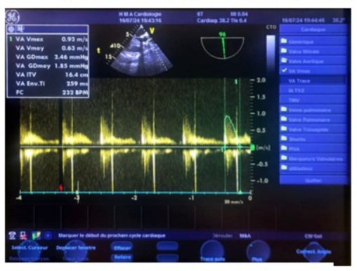 Left ventricular filling pressures were normal, and the inferior vena cava was dilated to 16 mm and slightly compliant. (Figure 3,4) The left atrium was dilated, with a surface area of 21.5 cm² and a volume of 44 ml/m². (Figure 5) The right ventricle had preserved systolic function with a TAPSE (Tricuspid Annular Plane Systolic Excursion) of 22 mm and a tissue Doppler S’ velocity of 12 cm/s. The right atrium was dilated at 19.7 cm², free of echoes. Assessment of the valvular apparatus showed a tricuspid aortic valve with degenerative changes, including calcified masses between the right and left cusps, limiting valve opening. Severe stenosis was noted, with a valvular area of 0.8 cm² (indexed area of 0.58 cm²), a Vmax of 3.93 m/s, and a mean gradient of 35 mmHg. The aortic annulus measured 19 mm, and minimal regurgitation was observed. (Figure 6-9)