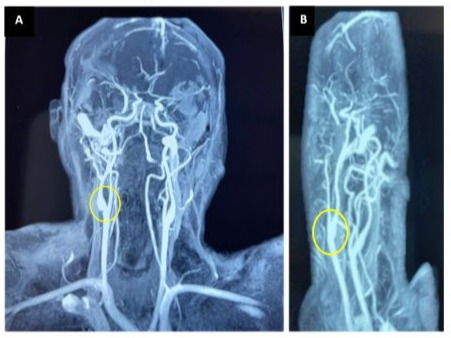 Figure 1: Cerebral MR angiography: Sagittal view (A) and coronal view (B) showing a right carotid web, appearing as a linear filling defect along the posterior-lateral wall of the right carotid bulb.