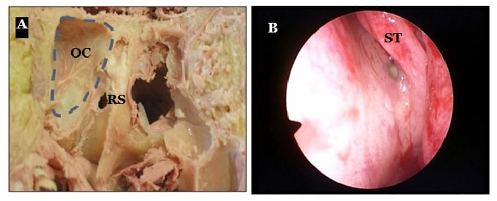 Figure 2:(A) The Onodi cell (OC) and the Rostrum Sphenoidale (RS) on a cadaver. (B) Endoscopic view showing the ostium of the sphenoid sinus along the tail of the superior turbinate - left side.