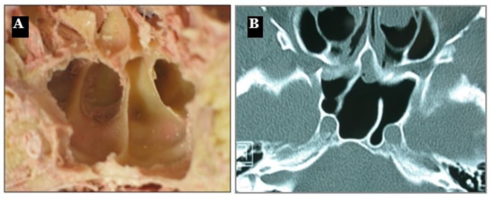 Figure 3: (A) Coronal cadaver view of the sphenoid sinuses. (B) Axial CT-scan demonstrating an oblique paramedian intersinus septum and a bony partition in the left sphenoid sinus.