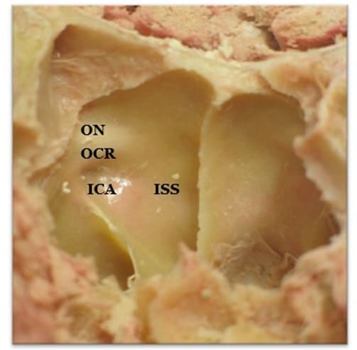 Figure 4: Cadaveric anterior view of the lumen of the sphenoid sinus and its right bony laterall wall, after removal of mucosa. The bulges of the internal carotid artery (ICA) and of the optic nerve (ON) can be seen. These form the optico-carotid recess (OCR). In the middle, the posterior insertion of the intersinus septum (ISS).
