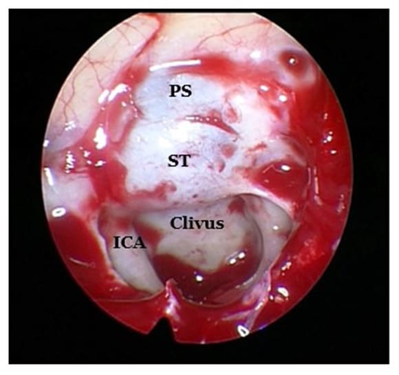 Figure 5: Endoscopic view during surgery showing the superior wall of the sphenoid sinus. Centrally, the bulge of the sella turcica (ST), anterior to it the planum sphenoidale (PS) and posterior to it the clivus. Lateral to the clivus, the paraclival portion of the ICA can be seen.