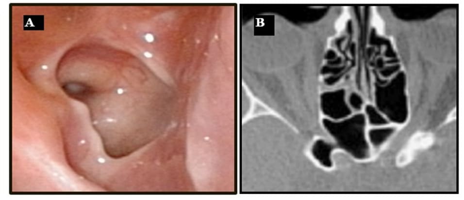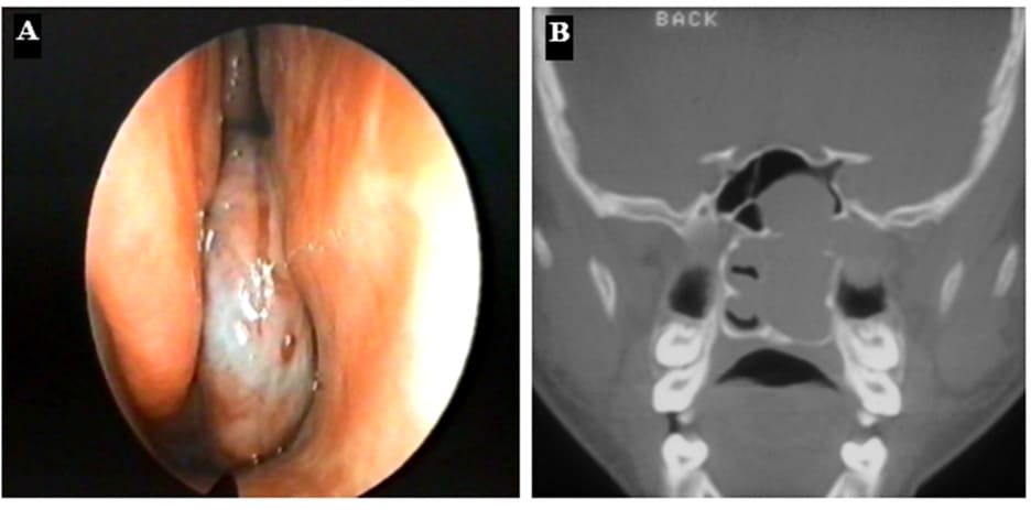 Figure 13: (A) Endoscopic view of a JNA in the posterior part of the right nasal cavity. (B) Coronal CT-scan of a patient with a JNA on the left side: complete nasal obstruction, bulging in the sphenoid sinus and widening of the pterygopalatine fossa.