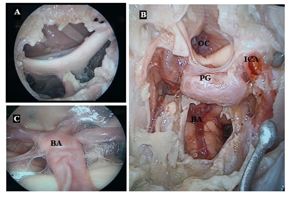 Figure 7: (A) Dissection on cadaver; visualization of the optical chiasma after removal of the planum sphenoidale and incision of the dura mater. (B) Wide dissection showing the pituitary gland (PG) in the center, the proximity of the genu of the ICA, the optical chiasma (OC) and the basilar artery (BA) once the clivus is drilled out. (C) Basilar artery in front of the pons.