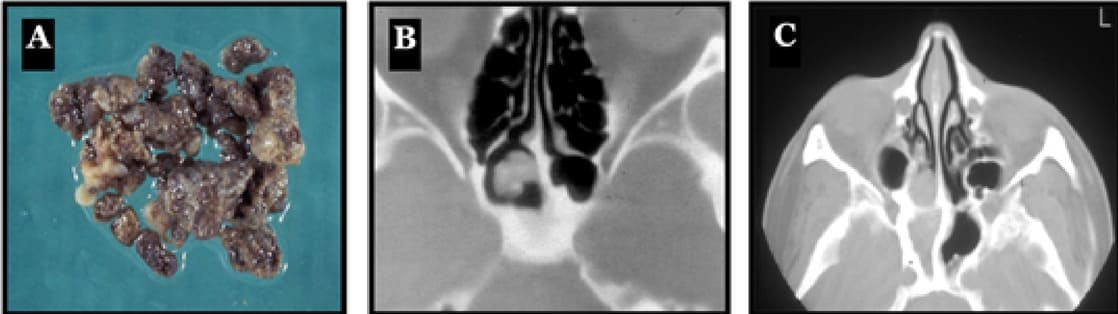 Figure 9:(A) Macroscopic view of a mycetoma shows grey and compact material. (B) Axial CT-scan of a mycetoma characterized by an opacity in the sphenoid sinus with surprisingly, a patent ostium. (C) Typical axial CT-scan of a fungal ball in the sphenoid sinus. The image reveals a polyp extruding from the ostium of the sphenoid cavity, a sclerosis of the bony walls and a complete opacity of the sphenoid sinus. In this case, no microcalcifications can be seen.