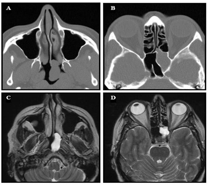Figure 10: A case of a sphenochoanal polyp. (A) Axial CT-scan showing an opacity in the nasopharynx. (B) Axial CT-scan showing opacity of the left sphenoid sinus. (C) T2-weighted axial MRI showing homogeneous opacity of the polyp in the nasopharynx. (D) T2weighted axial MRI showing a hyperintense lesion in the sphenoid sinus.